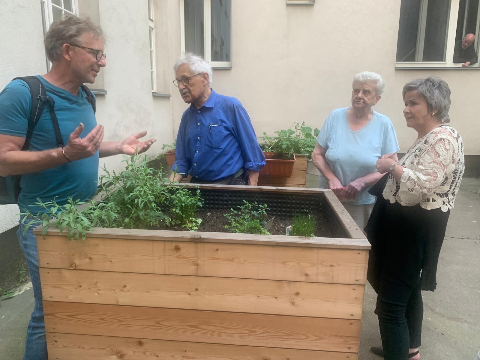 Die Hochbeete im Gemeindebau brauchten vor allem die Tatkraft von Lili Hundstorfer, Chefin der hochformatigen Bezirkzeitung. Und die Unterstützung der wohnpartner, die für das Zusammenleben im Gemeindebau sorgen und Beete, Erde und Knowhow zur Verfügung gestellt haben. Frau A. war damals, als alle befragt wurden, eigentlich dagegen. Heute düngt und erntet sie gerne, erzählt sie am Stammtisch des ACHTSAMEN 8. Jetzt trifft man sich wieder im Hof, wie früher um die Bassena nun rund um die Hochbeete, zum Tratschen.